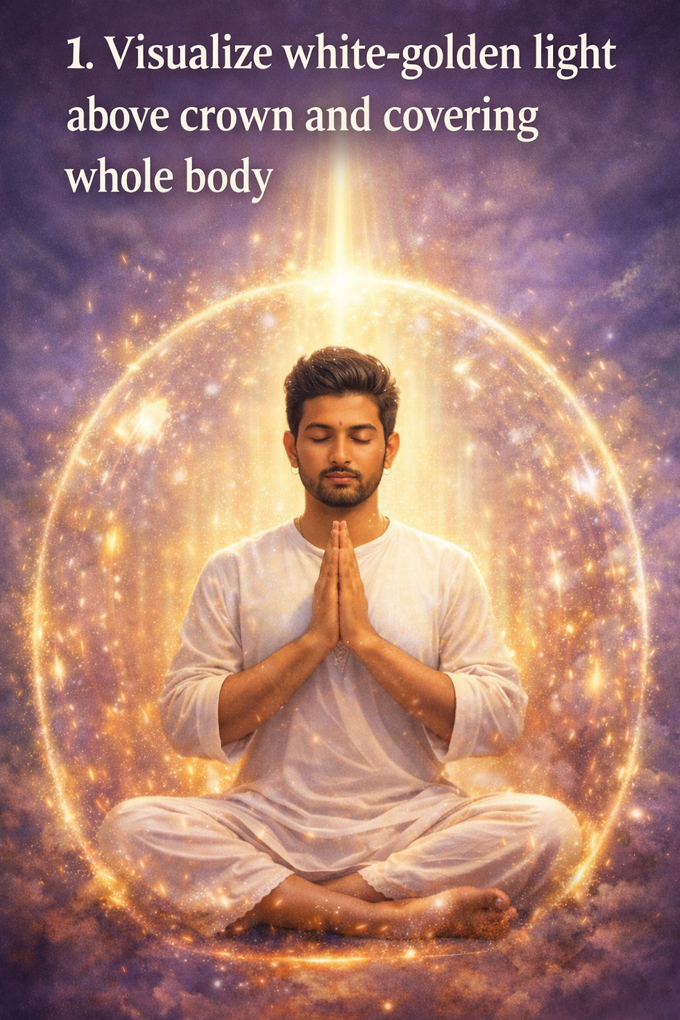 · Visualize a soft, white golden light coming from above your head. Let it enter your body, starting from your head, chest, stomach, and to your feet. Now imagine this light forming a protective bubble around you.